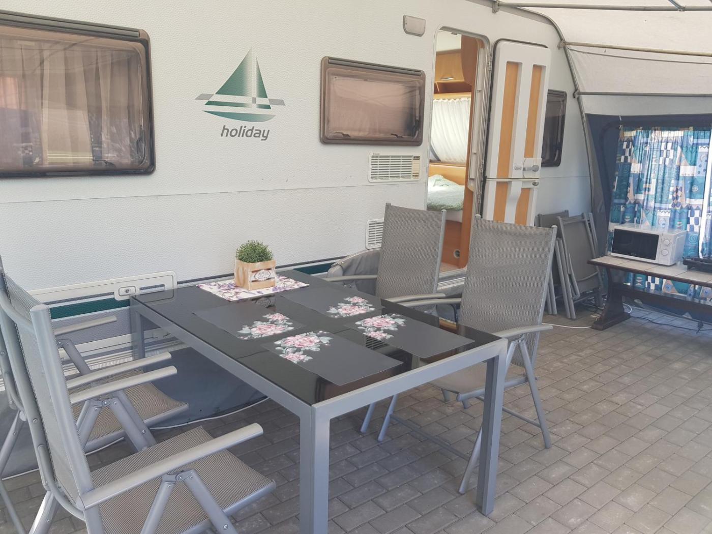 Przyczepa kempingowa. Boasting an outdoor dining area, this mobile home also offers a tea and coffee maker, a seating area and a TV. The unit has 4 beds. Domek holenderski - 4 osobowy. Powierzchnia pokoju ok.: 20 mkw.